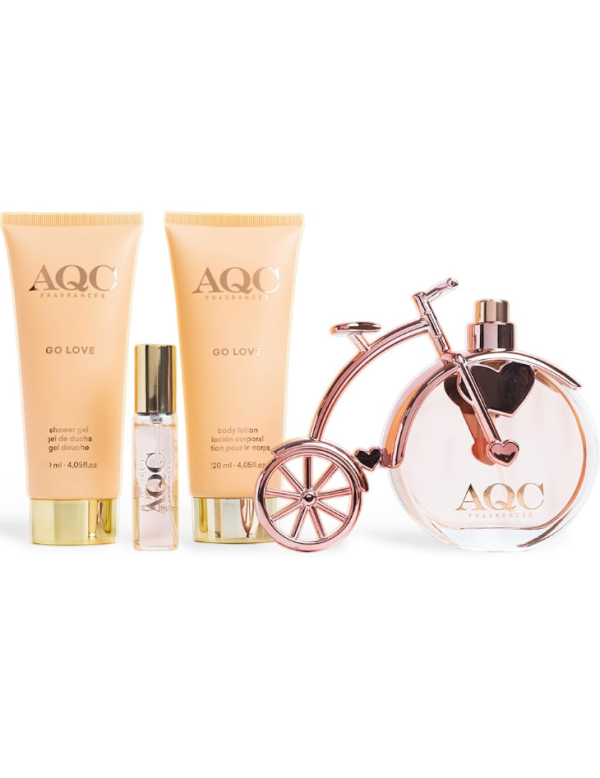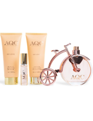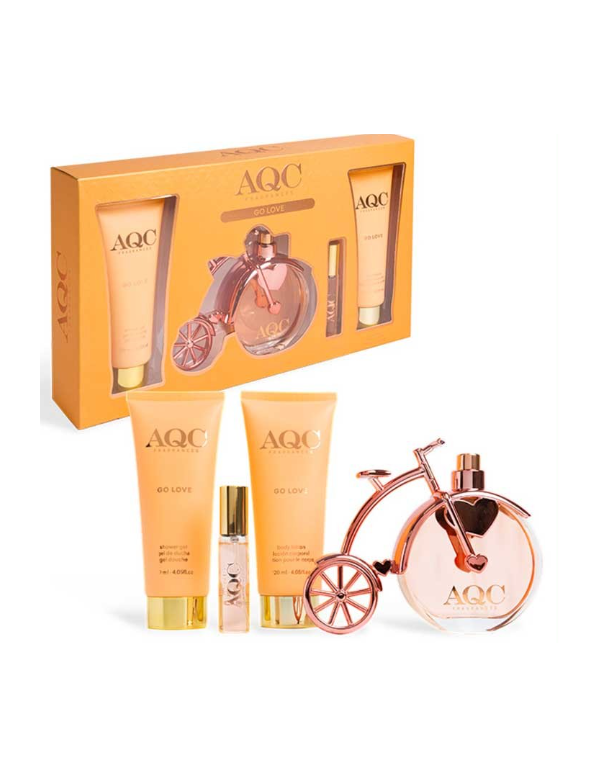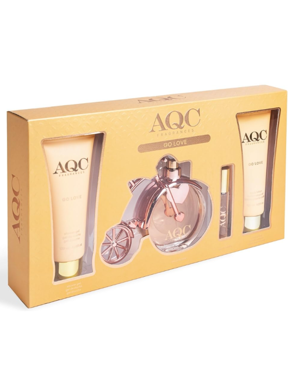 Le Coffret AQC Go Love est une invitation à la tendresse et à la féminité. Il contient une eau de parfum 100ml, un déodorant 200ml et un gel douche 250ml assortis pour une expérience parfumée complète.