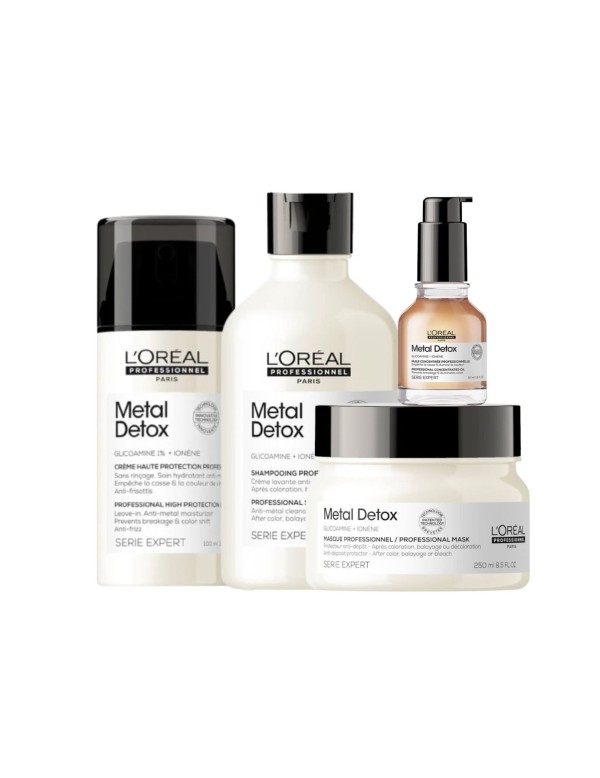 Le shampooing Metal Detox nettoie en douceur le cuir chevelu et les cheveux, élimine les impuretés et les résidus métalliques, tout en maintenant l’hydratation naturelle. Le masque Metal Detox nourrit intensément, réduit la casse et les frisottis, apporte souplesse et brillance, et restaure la vitalité de la fibre capillaire. La crème Leave-in Metal Detox protège les cheveux tout au long de la journée, facilite le démêlage, redéfinit les boucles et apporte un effet doux et soyeux, tandis que l’huile Metal Detox scelle les pointes, offre un effet anti-oxydant, prolonge la couleur et apporte une brillance éclatante.